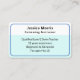 Gör ett bra intryck med detta moderna och stilrena visitkort för en simlärare. Personifiera med ditt namn, jobbtitel och mer information på framsidan, och dina kontaktuppgifter på baksidan av kortet. På baksidan finns också en QR-kod, till vilken du kan lägga till din egen webbplats URL, för potentiella kunder att skanna och ta reda på mer. Designen använder ett enkelt färgschema av blått och vitt med svart text.