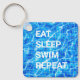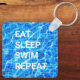 Den här moderna designen har en gnistrande blå simmande bassäng-bakgrund med texten "Eat Ssov Simma Repeat" i modern typografi #accessoarer #keychains #gifts #tullgifts #giftsfortjejer #giftsforboys #giftsforher #giftsformen #simming #giftsforswimmimming