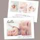 Minsta födelsetillkännagivande i gender/neutralt som visar ditt baby-foto överlagrade med "hej" i ett enkelt skript och deras namn, födelsedatum och födelsestatus i modern typografi. På baksidan lägger du till ytterligare tre bilder och ett personlig-meddelande.