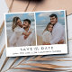 Två foto bröllop spara datum, perfekt för ditt Kaliforniens strandbröllop (eller någon annan kustplats). Anpassa med två av dina favoritfoton på förlovningen och din bröllop-information.