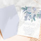 Vackra blåaktiga bröllopsinbjudningar i blommigt har söt Mejerblått vintage stil blommor och en helt vanlig design med elegantens kalligrafi-skript typografi. Baksidan är klassiskt pulverblått.