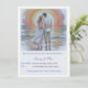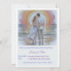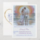A lovely and simple boho wedding invitation card of a couple on the beach at sunset in a light blue background