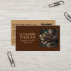 Simple brown and caramel business card for chocolate makers with cacao photo and social media icons. Features QR code, Facebook, Instagram, WhatsApp, Pinterest. Customize name, title, business details, contact info, social handles. Perfect for artisan chocolate professionals.