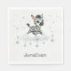 Cute baby shower or birthday paper napkin featuring adorable little male zebra sitting on the clouds with some blue love hearts
