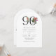 This 90th birthday invitation features a clean, sophisticated arch shaped design with a touch of elegance. The number "90" is prominently displayed in large, graceful serif font embellished with vibrant tropical flowers and lush foliage to add a burst of color and painted details. Palm fronds, hibiscus, fig blossoms, anthuriums, bird of paradise, and orchids adorn the number "90" with beauty and elegance for this special milestone birthday celebration. Below the age, the event details are presented in a smaller, equally elegant serif font, ensuring the layout remains balanced and sophisticated. The overall layout is minimal yet chic, with generous spacing between elements to maintain clarity and elegance, creating an invitation that feels both personal and timeless. Personalize the easy-to-use text template with your event details. These invitations may be ordered in both printed and instant download digital formats.