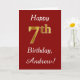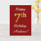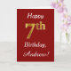 Den här enkla födelsedagskortsdesignen innehåller meddelandet "Lycklig 7:e födelsedag", där "7:e" har ett utseende som liknar guld. Den har också ett eget namn och en röd bakgrund för mörken. Det skulle kunna ges till någon som firar sin sjunde födelsedag.