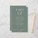 Simple, minimalist sage green wedding table number card with guest names seating chart.