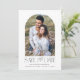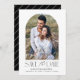 Meddela din bröllop-dejt i stil med vår moderna fotofilm spara datumet. Datumkortets enkla sparande innehåller förlovningens foto i ett vitt fack ram. "Spara datumet" visas i svart modern serif- och script-typsnitt. Anpassa framsidan av datumet för att spara datumet genom att lägga till namn, datum för bröllop och plats för bröllop. Kortet återgår till visning ett svartvitt rand mönster.