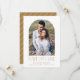 Meddela din bröllop-dejt i stil med vår moderna fotofilm spara datumet. Datumkortets enkla sparande innehåller förlovningens foto i ett vitt fack ram. "Spara datumet" visas i guld moderna serif och script typsnitt med vit bakgrund. Anpassa framsidan av datumet för att spara datumet genom att lägga till namn, datum för bröllop och plats för bröllop. Kortet återgår till visning vid guld och vit rand mönster.