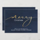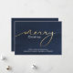 Klassi och elegant - marin blå vattenfärgsbakgrund med guld-effekt Skripttexten "merry" jul i finare. Med det här platta hälsningskortet för snyggt hälsar du din familj och dina vänner med klass och sofistikering i julhelgen. Design Copyright © CustomChristmasPhotoCards.com