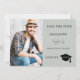 On front: Add your own vertical size photo of the graduate. A trendy muted sage green colored background, black text. Templates for a name and date. The name is written with a modern hand lettered style script. With a cap, tassel topper.