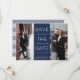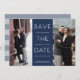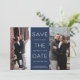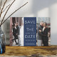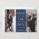 Datumfotokortsfunktionerna sparar serif och kursiv stil i skarp vit, med namn, datum och plats för bröllop som är sammanflätade med "spara datumet". Texten är centrerad på en blå bakgrund i riken som delar upp två av dina favoritfoton i lodrät eller porträtt-orienterade förlovningar. Anpassa med din inbjudningsinformation och/eller bröllop webbplats längs grund. En chic sparar datumvalet för det moderna par med en minimalistisk estetik.