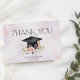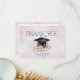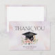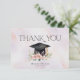 A clean and modern graduation party thank you card. The front features an elegant abstract watercolor background. Soft pale purple and blush pink tones add a gentle, feminine touch, creating a polished and stylish card for show you appreciation to celebrating this special milestone with you. A beautiful watercolor illustration of a student cap with gold tassel with pretty pink flowers and green leaves.