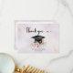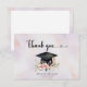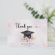 A clean and modern graduation party thank you card. The front features an elegant abstract watercolor background. Soft pale purple and blush pink tones add a gentle, feminine touch, creating a polished and stylish card for show you appreciation to celebrating this special milestone with you. A beautiful watercolor illustration of a student cap with gold tassel with pretty pink flowers and green leaves.