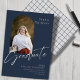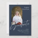 Den här platta studenten-annonsen på 5 x 7 tum innehåller ett bågfoto på framsidan på en marktblå bakgrund med ljusmarkering av grått. Bland platshållarna finns student, namn, högskola eller universiteten namn grad, fokusområde och ytterligare information, t.ex. speciella hedersbetygelser.