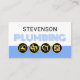 Cover features a white and light blue layered design. Over at the top lies your prestigious name and the business name "PLUMBING" in light blue; Change the caption to suit your own service needs. Inside the blue layer is an array of gold plumbing icons.