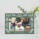 Your horizontal or landscape oriented photo is framed by an assortment of winter greenery and foliage. The snow white botanical accents are set against a sage green background. There's a spot to add your own custom greeting at the top, your own from message below the photo and your own longer message on the reverse side.