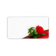 A striking image of a red rose lying gently on a red-and-white surface with soft green leaves and white floral accents. With ample negative space, this photo is ideal as a backdrop for personalized messages, celebration cards, digital designs, or wall art. Suitable for romantic, festive, or memorial themes.