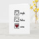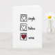 This card shows a funny checklist about relationship status, set on a plain white background. There are three rows, each with a small black square checkbox that has a heart inside it. Next to the boxes, the words “single,” “taken,” and “wine” are written in simple black handwriting, lined up down the page. The hearts beside “single” and “taken” are just black outlines, like they haven’t been chosen. The heart beside “wine” is filled in with a dark red color, and the red ink goes a little outside the heart, like it was colored in quickly. That one red heart makes the joke clear and gives the card a flirty, self-loving feel 💘😘.