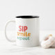 Njut av varje sipp med ett leende! Den här charmerande 11 oz tvåtonsmodellen mugg ger värme och glädje till kaffebrytningarna med sin lekande design "Sip, Smile, Repeat". Med ett bekvämt handtag och snyggt kontrast insida är det perfekten att lägga till en kopp färg och positivitet till din dagliga rutin. Oavsett om det är hemma eller på kontoret, är det en påminnelse att sparka varje ögonblick, en sipp i taget.
