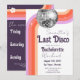 Sista Disco möhippa resplan och inbjudan mall. Anpassningsbar, personlig, redigerbar nedladdning, retro groovy disco vuxenfest tvåsidig inbjudan med festaktiviteter