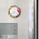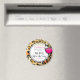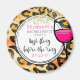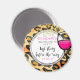 En magnet för en möhippa. Ett leopardmönster som bakgrund. Ett snyggt vin glas med tjock svart bläck runt om. Vinet i glaset är varmt rosa. Klara och starka färger. Anpassa med din möhippa info på en vit handritad cirkel. Sista festen innan ringen skrivet i ett coolt och trendigt teckensnitt. En bild av falskt guld glitter ger illusionen av glitter utspridda längs toppen.