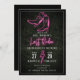 Inbjudningskort för möhippa med rosa neonskylt inspirerad illustration av cowboy-stövlar, "Sista Rodeo", och blixt över boxwood grönska bakgrund.