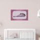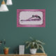 Det här är ett stilat teckning av en balettdansare som sträcker sig över hennes ben. Det har en gräns vid ro rosa med svarta virvelar.