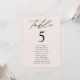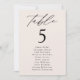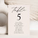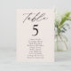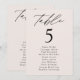 Elegant bröllop-sätesdiagram med "bord" som visas i svart calligrafskript med bordsnumret och gäst namn visas nedan på en krämbakgrund. Utformningen upprepas på baksidan. Om du vill beställa bordsnumrets sittande diagram redigerar du varje kort med bordsnumret och gäst namn och lägger till det i kundvagnen. Designad att samordna med vår moderna elegance bröllop-samling.