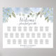 Bröllop kan rymma 250 gäster på 25 bord med 10 platser per bord. Den skryter med en beundransvärd bohemisk design, försedd med rustik, handmålad ro, blommor och blommar i muterade skuggor av dammblått, kompletterad med grönt eucalyptus löv och verdant trädgårdslöv. Rubriken: "Välkomna! Sök efter bord" skrivs i en elegant-skriptkalligrafi. Diagrammet innehåller även utrymme för parets namn och datumet för bröllop. Det här sittkartan är ett fantastiskt sätt att välkomna gästerna till din mottagning och samtidigt se till att de lätt kan hitta sina platser.