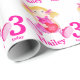 Födelsedag som slår in papper som presenterar en gullig trasatrasadocka med gult ullhår i rosa och rött. Personifiera detta nyckfulla flickafödelsedagpapper med din namn och ålder. Läser för närvarande Hailey 3 i dag. Unikt målat i vattenfärg och designat vid Sarah Trett.