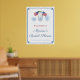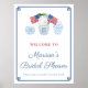 Klassiska blå och vita blommor och USA-flaggor i en vas med ingefärsburk pryder denna välkomstskylt för festen. Visas här för en bröllopsfest, men all text kan anpassas efter dina behov. När det gäller den grekiska nyckelfrisen kan du ändra färgen genom att ändra bakgrundsfärgen för designen (öppna designverktyget genom att klicka / trycka för att anpassa ytterligare). Om du behöver affischen i en annan storleksproportion (inte 2:3) kan det hända att du behöver justera den här ramen så att den förblir på rätt avstånd från kanten. För att göra detta väljer du ett av lagren som heter "Greek Key half corner..." och använder piltangenterna för att flytta vänster eller höger). Du måste göra varje halva av bakgrunden separat.