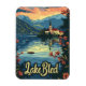 En seriös och nostalgisk skildring av Sjö Bled i Slovenien, berömd för sin skönhet och lugn atmosfär. Konstruktionen fångar den ikoniska Bled-ön med sin charmerande kyrka, den medeltida Bled Castle som gick på en klippa och de omgivande Julianska Alpernorna. I en vintage stil frammanar teckningen den förtjusande och idylliska charmen från Sjö Bled och uppmanar tittarna att uppleva sina scenlandskap och serene vatten.