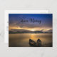"Byte av Adress"-vykort med det vackra fotot av ett fredligt sjö med båtar och solnedgång.