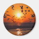 Silhouetterna från en flock fåglar som flyger över sol på Sjö Eries kuster. En funky bild, arv från National Scenia Byways Online.