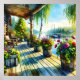 Ai-konst som skildrar en vacker syn på ett däck på ett hus i sjö tittar ut på bukten med båtdockor och ett däck invändigt med blomkrukor.