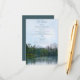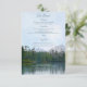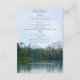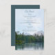 Detta pittoreska rustika landskapsbröllop detaljer kort har en olja pastell skiss av en lätt krusad men lugn sjö, med avlägsna frodiga städsegröna träd, cedrar och klippor som speglas på dess yta, och avlägsna berg under en blå himmel med tunna moln ur en paddlare kajak på sjön eller en vandrare på motsatt strand - blandad teckensnitt text är en koordinerande mörk tealblå - av katz_d_zynes
