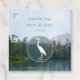 De här märkrna för giftermålad bröllopsförmån har en oljekastskiva av ett lätt moget men lugn sjö, med avlägsna evergreener, kedar träd och sten som reflekteras på dess yta och avlägsna berg under ett blå himmel med kloka moln, accentuerade av en silhuvad öron/egret i vitt vid en halvgenomskinlig cirkel - av katter z_d_zynes