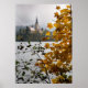 Sjö Bled i höst, träd i vasst fokus och kyrkan i mjuk fokus efter.