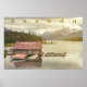 En bild av en träbåt på Maligne Sjö, Jasper nationalpark i Kanada, som ligger mitt i en bakgrund av berg med tak över snö och en lush-skog. Båthuset har ett rött tak med vit trim och ord "Malign Sjö Boat House" målade på det. Flera röda och vita kanoter är dockade vid träpiren och deras reflektioner skymmer vid lugnen vatten.