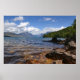 Glacier National Park har många vackra sjöar och Sjö McDonald är ett av de mest lättillgängliga. Här är en syn på sjö på morgonen med sol precis stigning och en silhuett av staplat sten.