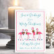 Tropiskt julhälsningskort med festliga flamingor och anpassningsbar. De vita platta korten har fyra flamingor som står bland små havsstjärnor. De bäror festliga hibiscus och hollykrister. Ett tunt gräns i rosa trimmar 5 x 7 tum kort och all linjer text är lätt att ändra eller ta bort. Exempel: "Seas och hälsning för ett God jul och Gott nytt år" med namnteckning längs grund. Reverse är fast tropiskt blått. Perfekt att skicka från en familj eller grupp som är bosatt på en tropisk plats.
