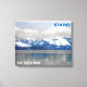 Tittar öster från Sandpoint, ID över Sjö Pend Oreille (pond uh-ray) på en vinterdag; berg täckta av snö i avstånd. Iset har bildats vid kusten och sträcker sig över sjö. Blått och grått är det dominerande färg. Anpassadet som läser "IDAHO" visas också. Det finns också ett ställe som kan lägga till ytterligare text.