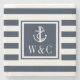 Elegant personlig initialer monogram underlägg med ankare och marinblå och vit randig mönster med din monogram initialer i en marinblå kantad fyrkant. Designad av Thisisnotme©