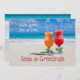 Julhälsningskort för tropisk strand till havs och Hälsning. Frostiskt cocktails sitter på en sandstrand i den här konstruktionen. Skicka från ett varmt klimat. Anpassa med ditt val av hälsning.
