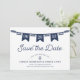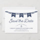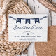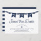 Ahoy! Gör det till officiell och inbjudan för dina gäster i bröllop att märka sina kalendrar med den här nautiska chicen spara datumkorten i en klassisk palett med blått och vitt i färg. Sjöfartsdesignen har ditt bröllop-datum som visas på en buntning av nautisk signal flaggor, med "spara datumet" och dina bröllop-detaljer i en blandning av block- och skripttypografi som accentueras med en liten frakts fästpunkt. Kort tillbaka till Wide Navy och White vågrät rand.