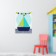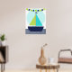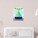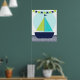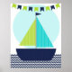 En sjöfart marin design nursery affisch som är bra för bebis rum eller ett äldre barns rum med en segelbåt med gröna och teal segel, en limegrön och marinblå flaggbanner och ränder i chevron-mönster på vattnet!
