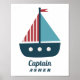 Snygg poster för pojkrum eller barnkammare. Illustration av en båt i blå och röd färg med anpassad text längst ner som säger "kapten". Lägg till ditt barns namn längst ner.