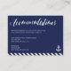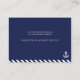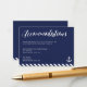 Inneslutningar i Nautisk bröllop affärskort med marint blått och vitt rand, vit ankarpunkt och anpassningsbar vit text utskriven på marinblå bakgrund