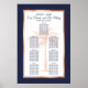 Lägg till din egen speciella beröring till den här eleganten med ett modernt skript och marinblått text, inklusive en konstnärlig silhuett för ro i handflatan med träd med en metallisk guld av koppar från ro. Den här sittplatskartan har namnen från bruden och brudgummen tillsammans med orden "Ät, Drick, Var vänlig och hitta ditt säte". Mallar finns för upp till sju bord med upp till 10 eller 11 namn per bord.